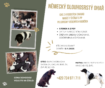 Chovatelská stanice Z Vysockých zahrad nabízí štěňata Německého dlouhosrstého ohaře z opakovaného úspěšného vrhu po myslivecky vedených rodičích - 5 fenek a 2 psy. Otec Gary z Horákova Dvora (V1, CAC, KV, BOS, ZV, ZVP, LZ, VZ), matka Anita z Bzeneckých vinic (VD, PZ, ZVP). K odběru kolem 5.11.2025. Kontakt: chalojir@gmail.com, tel. 724971711. Cena dohodou