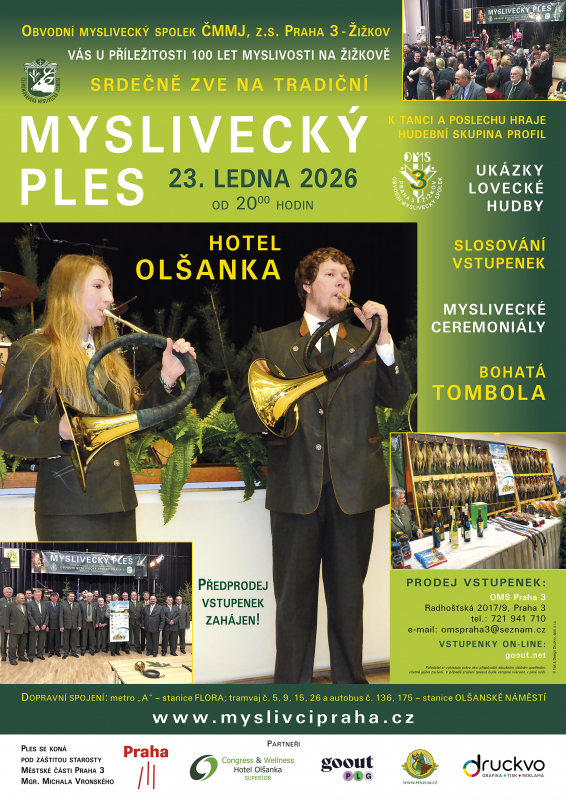 Obvodní Myslivecký spolek ČMMJ Praha 3 pořádá tradiční Myslivecký ples na Žižkově, který se letos uskuteční pod záštitou starosty Městské části Praha 3 v pátek 23. ledna 2026 od 20:00 v hotelu Olšanka.