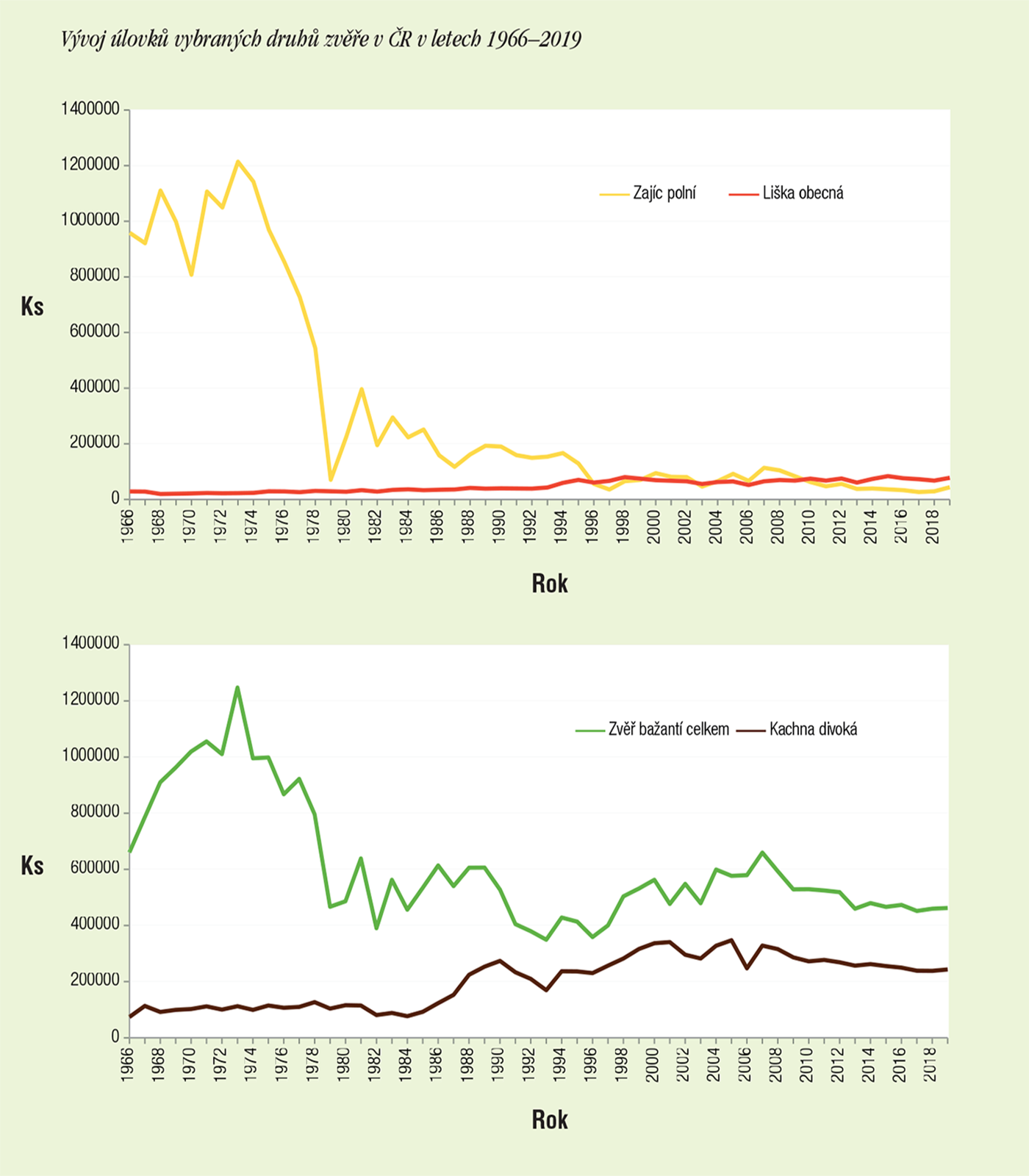 Co se týče zajíců, myslivecký rok 2019/2020 lze z hlediska trendu posledních let hodnotit jako lovecky velmi úspěšný, významně vybočující z průměru. Dosaženými 43 914 kusy jsme se přiblížili hodnotám z počátku současné dekády, přičemž lví podíl na loňském nárůstu úlovku mají především honitby na jižní Moravě. Za rok 2018/2019 byl nahlášen úlovek zajíců 29 168 kusů, což znamená, že v minulé sezóně došlo k nárůstu o 14 746 kusů (téměř o 50 %). Na příznivý vývoj početnosti zajíců měl pozitivní vliv fakt, že rok 2019 byl „myším rokem“ (přemnožení hrabošů), takže predátoři se orientovali na jinou kořist než na drobnou zvěř.