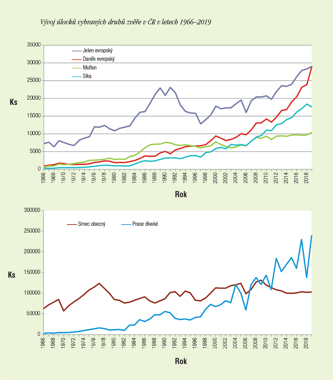 To úlovky prasete divokého jsou v posledních letech naopak jako na houpačce, ale na to jsme si již zvykli. Po „sešupu“ z rekordních 230 065 kusů dosažených v roce 2017/2018 na 138 174 kusů v roce 2018/2019 vloni následoval strmý nárůst oficiálního úlovku na 240 511 kusů, meziročně o 102 337 kusů (74 %). U zrodu nového rekordu stála vedlestabilních zdrojů potravy na polích a vnadištích úroda žaludů v roce 2018 a „citlivý“ přístup značné části myslivců k lovu divočáků po „pogromu“ před třemi lety. V konečném důsledku – tak, jak se předpokládalo – stavy černé zvěře po silném redukčním zásahu v roce 2017/2018 velice rychle zregenerovaly, a nový rekord byl na světě. Nutno podotknout, že k jeho vytvoření bezpochyby přispěl i dotační stimul ze strany státu v podobě 2000 Kč za každého uloveného divočáka nad tříletý průměr v honitbě, což v mnoha honitbách vedlo ke zintenzivnění lovu. Ve vyplácení dotací by se mělo pokračovat, tak se nechme překvapit, jak to ovlivní úlovek v aktuálním mysliveckém roce. Komplikací pro myslivce zvyklé lovit na vnadištích bude letošní semenný rok dubu a buku v některých oblastech republiky.