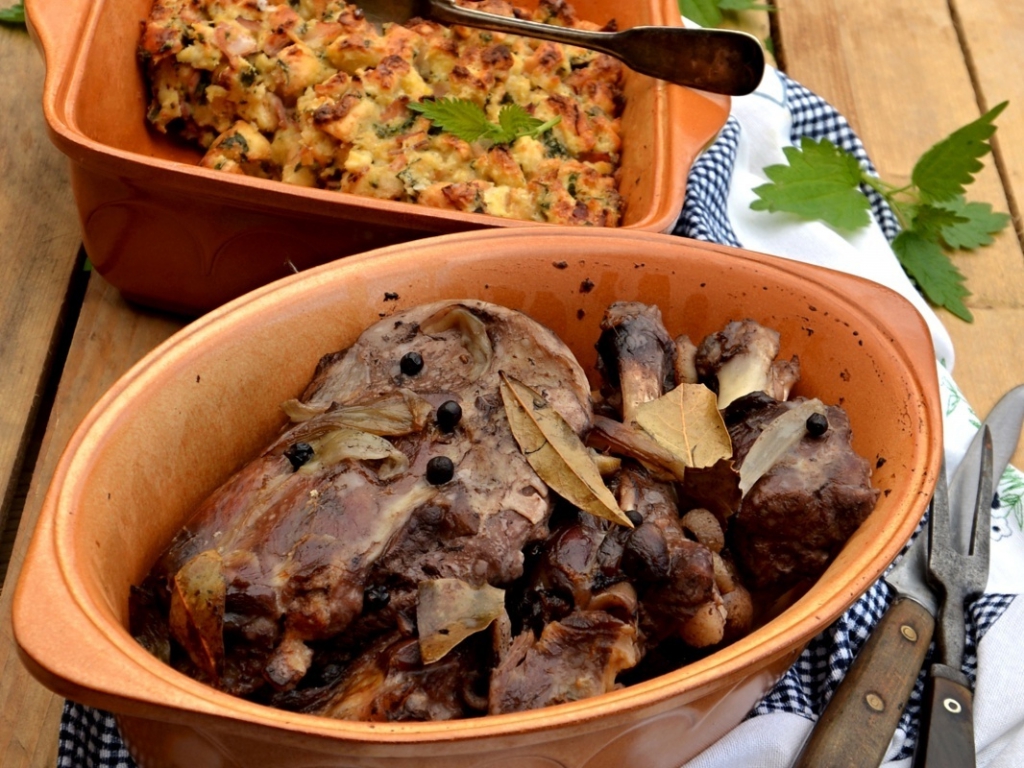 Pečenou mufloní plec podáváme s porcí nádivky a vařenými bramborami.