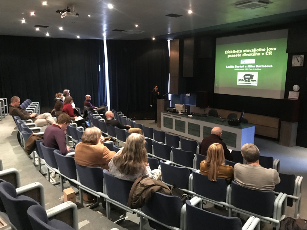 Po přestávce na kávu vystoupil Ing. Jan Cukor, Ph.D., (VÚLHM) s prezentací o vzorcích chování prasete divokého ve vztahu ke kadáverům v souvislosti s riziky přenosu AMP, Ing. František Havránek, CSc., (VÚLHM) mluvil o možnostech vyhledávání kadáverů černé zvěře s pomocí loveckých psů a program zakončil doc. Ing. Jiří Kamler, Ph.D. (MENDELU) příspěvkem o vlivu potravy na reprodukci současných populací prasete divokého v České republice.