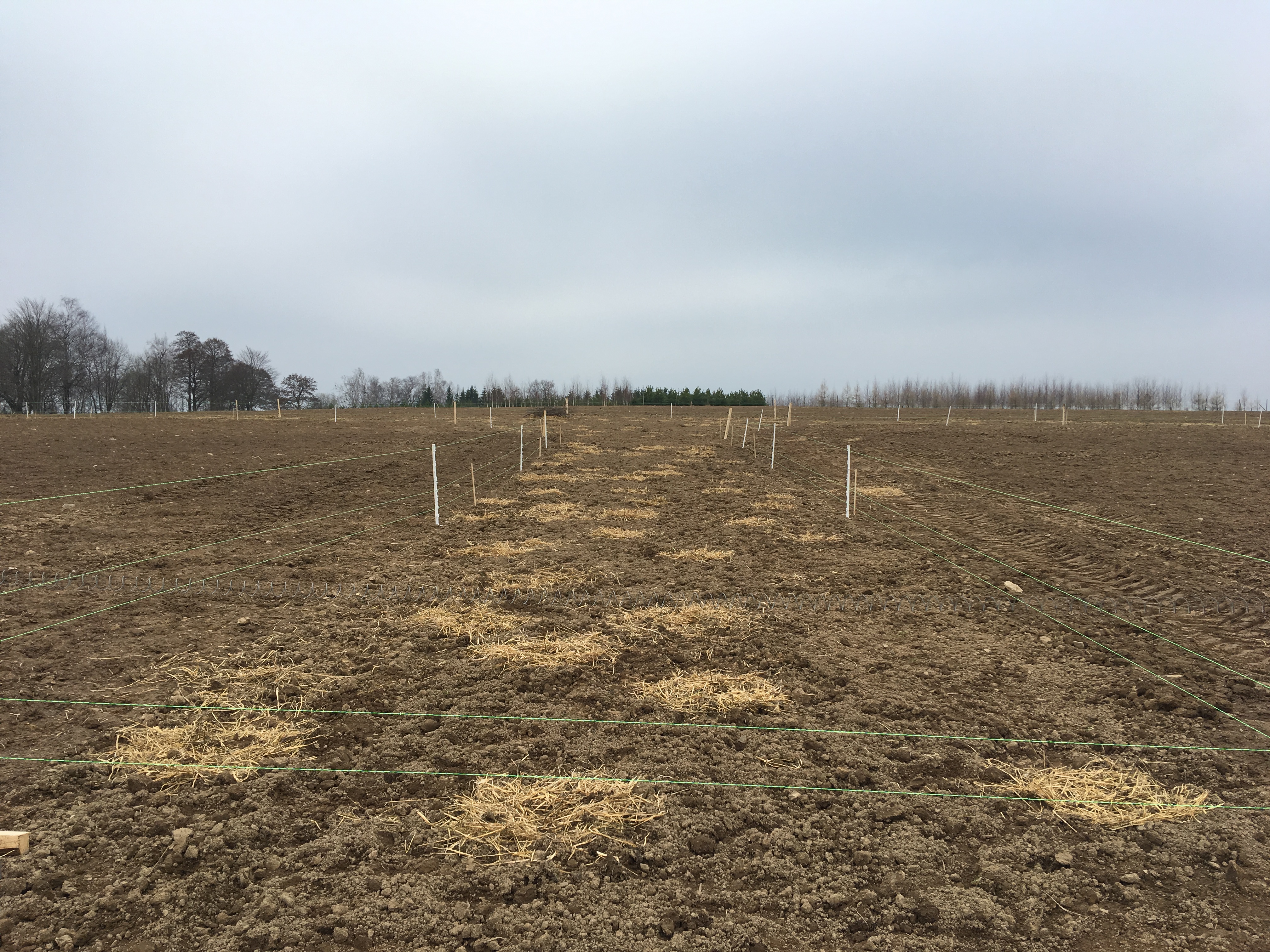 Remízek těsně po výsadbě na jaře 2019. Okolo každé sazenice byla rozprostřena ječná sláma podporující udržení vlhkosti, mírnějšího mikroklimatu a posléze fungující jako zdroj živin při svém rozkladu.