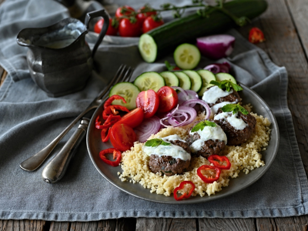 Pokrm servírujeme tak, že na polovinu talíře rozprostřeme kuskus, na něj položíme biftečky a přelijeme je jogurtovým dipem. Na druhou polovinu talíře rozprostřeme na tenké plátky nakrájenou čerstvou zeleninu.