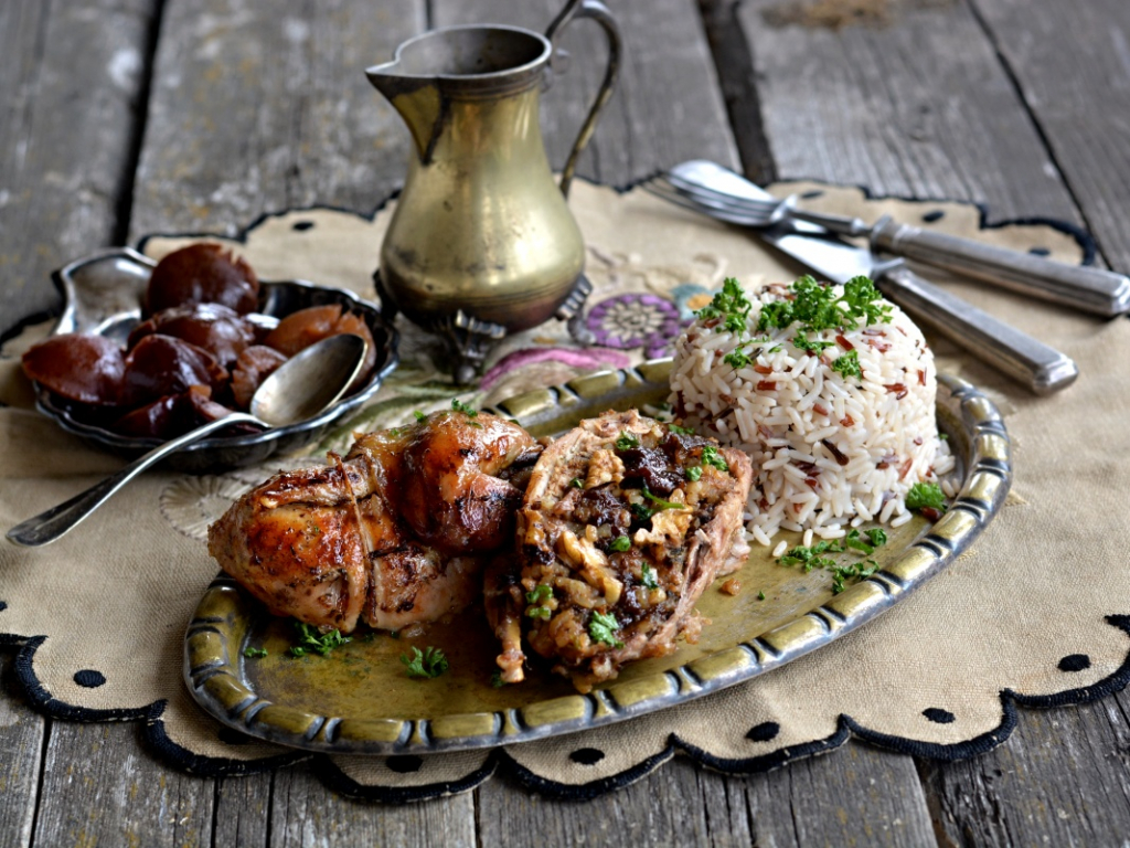 Druhý den propláchneme kulatozrnnou rýži studenou vodou, v kastrůlku na lžíci olivového oleje ji krátce orestujeme, osolíme, zalijeme zvěřinovým vývarem a za občasného promíchání pod pokličkou zvolna uvaříme doměkka. K uvařené rýži přidáme lžíci másla, promícháme a pod pokličkou necháme vstřebat veškerý vývar. Poté přidáme pokrájené sušené švestky a vlašské ořechy, nadrobno nasekanou kadeřavou petrželku, podle potřeby osolíme a dobře promícháme. Odleželé orebice naplníme rýžovou nádivkou, břišní otvor spíchneme párátkem, stehýnka a křidélka přitáhneme tenkým provázkem k tělu, vložíme do pekáčku, mírně podlijeme vodou a v troubě předehřáté na 200 °C pečeme asi hodinu doměkka a dozlatova. Během pečení orebice podle potřeby podléváme a přeléváme výpekem.