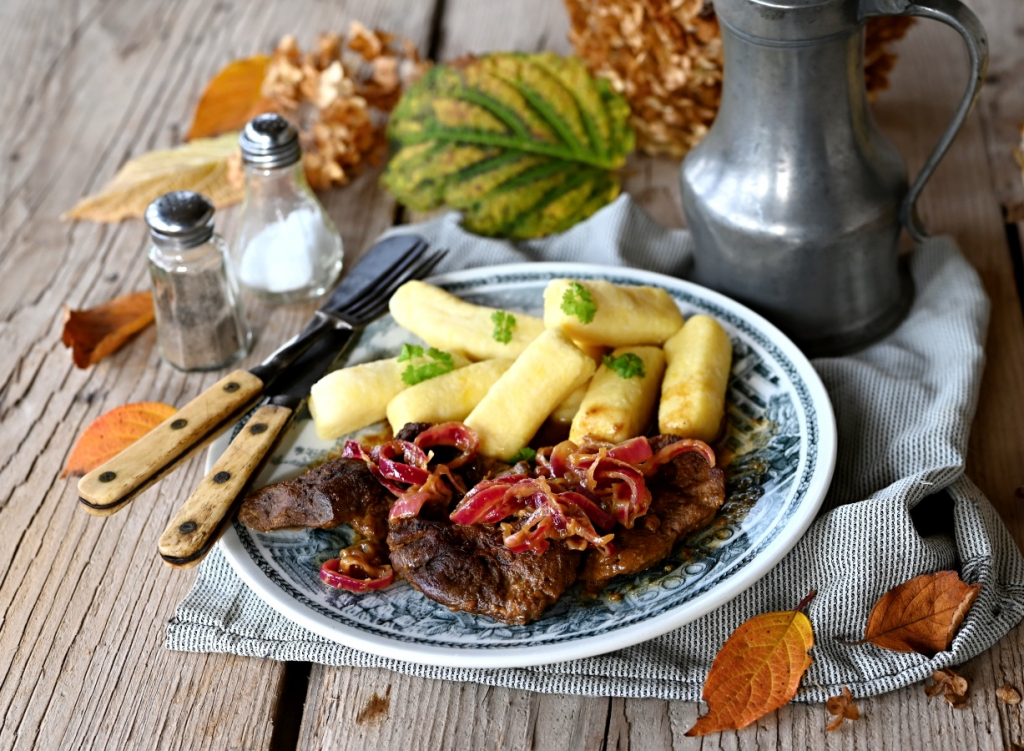 Plec z divočáka s karamelizovanou červenou cibulí podáváme s bramborovými špalíky.