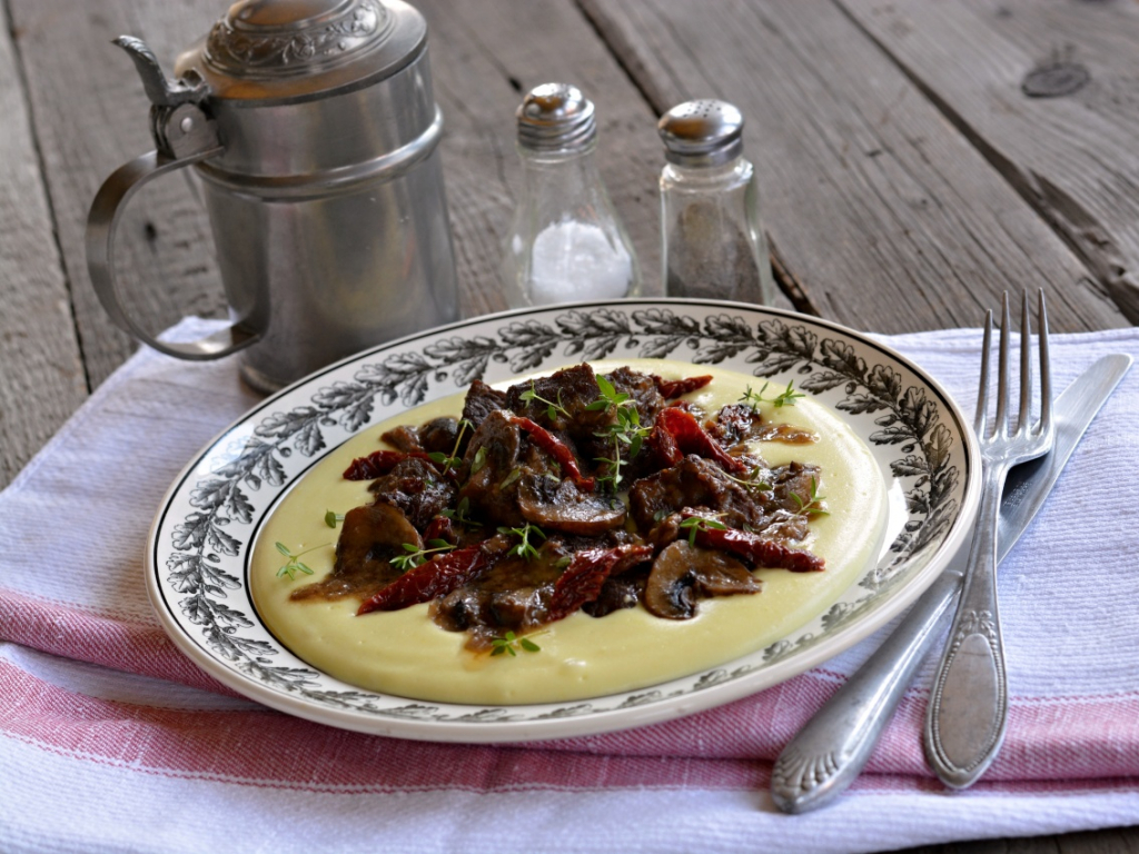 800 g srnčí kýty bez kosti, 400 g menších bílých žampionů, 120 g sušených rajčat, 1 malá šalotka, 500 ml zvěřinového vývaru, 2 lžíce hladké mouky, 2 lžíce slunečnicového oleje, rovná lžička sušeného tymiánu, sůl