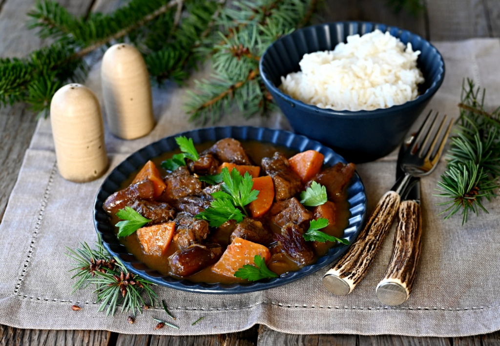 Vánoční srnčí tažín s batáty a datlemi podáváme s rýží.