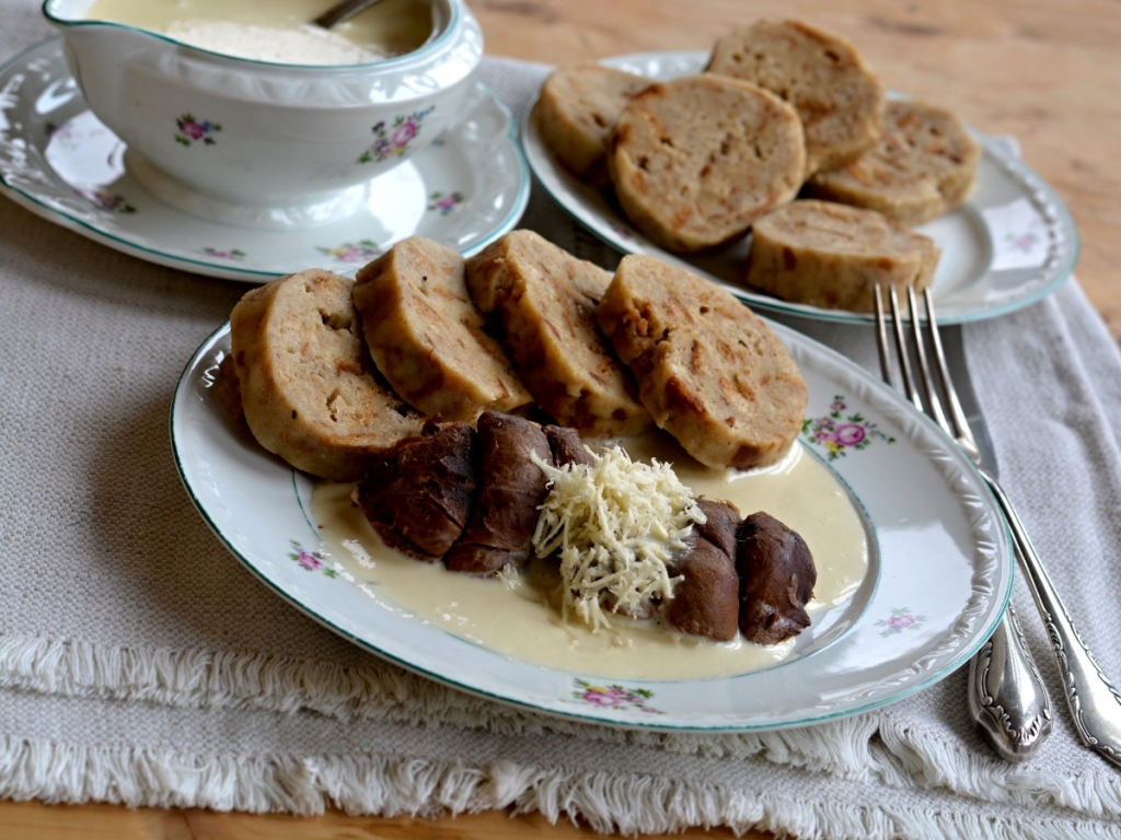 V době, kdy se vaří zvěřina, si připravíme knedlík. Chléb nakrájíme na kostičky a vsypeme do mísy. V mléce rozšleháme vejce, vlijeme na kostičky chleba, promícháme a necháme vsáknout. Po chvíli vsypeme mouku smíchanou s práškem do pečiva a špetkou soli. Vařečkou vypracujeme těsto, rukama namočenýma ve studené vodě vytvarujeme dvě šišky a v páře vaříme si 12 minut. Ostrým nožem nakrájíme na plátky.
