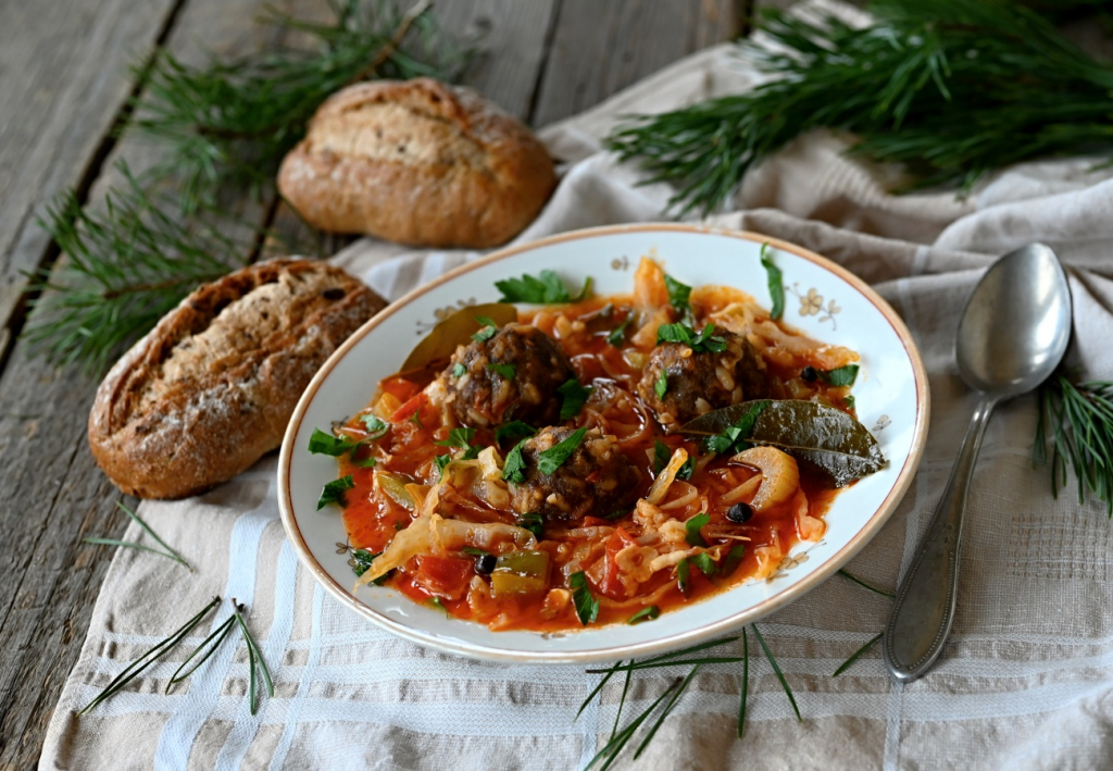 na polévku: 1/2 menší hlávky bílého zelí, 4 velká rajčata, 3 stonky řapíkatého celeru, 1 zelená paprika, 2 stroužky česneku, 100 g kulatozrnné rýže, 1,5 l zvěřinového vývaru, 6 lžic olivového oleje, 3 lžíce rajčatového protlaku, 2 lžíce třtinového cukru, 4 bobkové listy, 5 zrnek nového koření, 5 jalovčinek, citronová šťáva, sůl