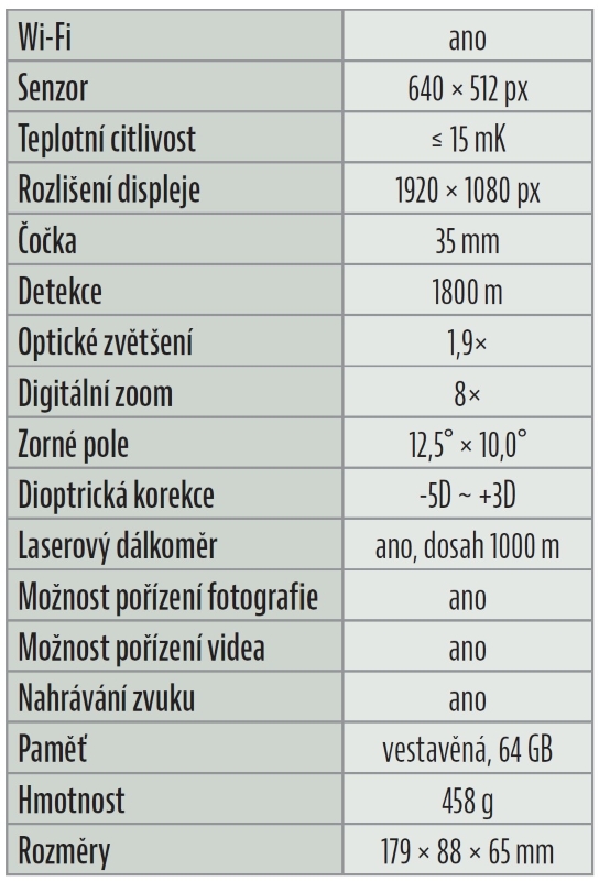 V propagačních materiálech prodejců jsem se dočetl, že monokulár Condor 2.0 je vybaven termovizním senzorem 640 × 512 px s teplotní citlivostí ≤ 15 mK, což má zajistit zachycení i těch nejmenších teplotních rozdílů, a to i v náročných podmínkách. Přístroj je dodáván ve dvou verzích lišících se ohniskovou vzdáleností čočky – 35 a 50 mm. Jak vyplývá z názvu mnou testovaného modelu – Condor CQ35L 2.0, jde o první variantu, která poskytuje s optickým zvětšením 1,9× detekční vzdálenost až 1800 metrů.