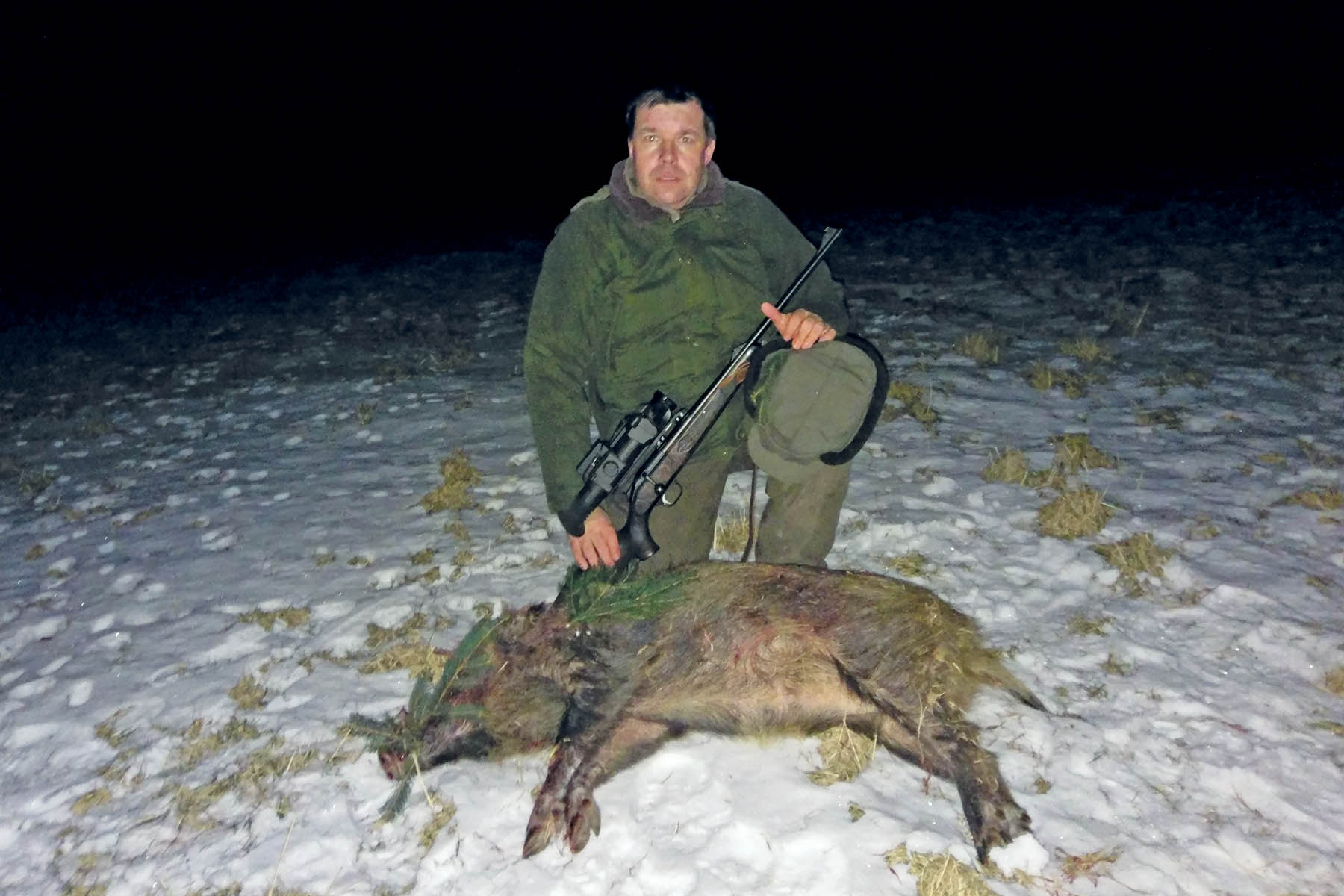 S kamarádem jsme v noci objížděli jeho pole a kontrolovali, jestli někde buchtuje černá. Na třech polích byla jen srnčí, ale na čtvrtém jsem ve vzdálenosti 500 metrů zpozoroval bachyni se čtyřmi selaty. O sto metrů dál byly další dva kusy černé a ve vzdálenosti asi 850 metrů ještě jeden. Chvíli jsme divočáky pozorovali a přemýšleli, jak se k nim dostat. Noc byla celkem jasná, při pohybu po poli bychom je jistě zradili. Půda byla po tání sněhu podmáčená, takže by nám čvachtalo pod nohama. Divočáci to ale vyřešili za nás. Nejvzdálenější kus se přiblížil ke dvěma uprostřed, chvíli byli spolu a dva se pak odpojili a odbíhali doleva. Mířili k lesíku a za chvíli se vynořili na jeho druhé straně. Odhadli jsme směr, kterým se asi vydají, a snažili se jim nadejít. Za několik minut jsme křižovali jejich pomyslnou dráhu pohybu a vyčkávali, zda se skutečně objeví. Vtom se vynořili z meze! Vzdálenost jsem odhadl na 180–200 metrů, ale dálkoměr ukázal 145 metrů. Když se přiblížili na 100 metrů, vypnul jsem dálkoměr a nastavil zvětšení na 5,6x. Táhl jsem s jedním z divočáků, kříž posadil 10 cm před ryj a zmáčkl spoušť. Kus se po několika metrech zlomil. Druhý divočák po ráně zrychlil, ale nepomohlo mu to – termovize ho i tak krásně zobrazila. První rána byla chybená, ale další ho zastavila. Zásah šel více dozadu, předsazení už bylo malé, ale přesto byla rána účinná. Bez termovize bychom o těchto divočácích nejspíš vůbec nevěděli. O tom, že bychom mohli odhadnout směr jejich pohybu a byli schopni jim nadejít a ulovit je, ani nemluvě.