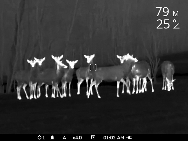 Takže co nového Pulsar Apex XQ50 LRF přináší? Označení XQ vyjadřuje, že je v něm použit čip (mikrobolometr) s rozlišením 384 x 288 bodů, ale na rozdíl od předchozí řady XD má 17mikronovou technologii namísto 25mikronové. V praxi to znamená, že přístroj s menším ohniskem objektivu bude mít větší optické zvětšení. Číslice 50 v označení je ohnisková vzdálenost objektivu, který přístroji dává optické zvětšení 2,8x. To lze digitálně zvětšit na dvoj‑, troj‑ a čtyřnásobek. Obnovovací frekvence čipu je 50 Hz. Obraz je tedy velmi plynulý, v pohybu se nijak netrhá a je bez zpoždění oproti reálu. No a písmena LRF označují laserový dálkoměr. Ten dokáže měřit vzdálenost až do 1000 m.
