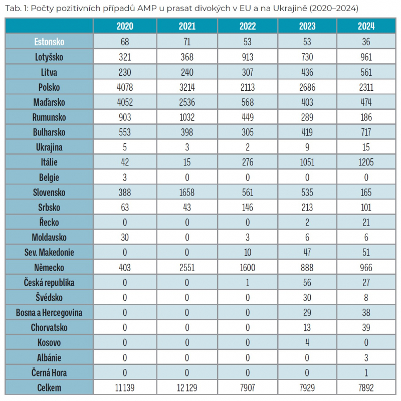 V průběhu roku 2024 byl AMP diagnostikován a hlášen z celkem 21 evropských států, z nichž 14 je členy Evropské unie (tab. 1, mapa 1).